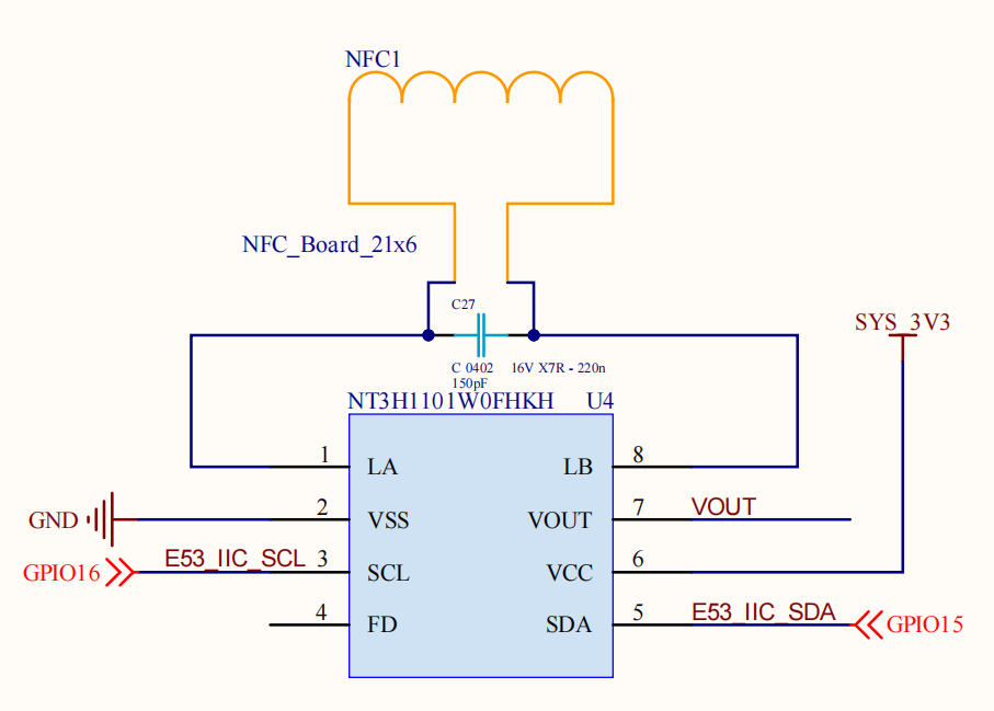 如下图所示,NFC芯片使用的是I2C协议,I2C_SCL与GPIO_15相连接,I2C_SDA与GPIO_16相连接,所以需要编写软件使用GPIO_16和GPIO_15产生I2C信号去控制NFC芯片