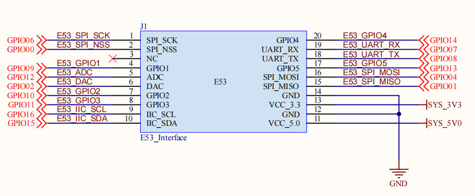 本案例将用到 E53_SC1 智慧路灯扩展板与 BearPi-HM_Nano 2 开发板,其中 E53_SC1 扩展板原理图如下,光照强度传感器 BH1750 是通过 I2C 来驱动,灯是通过 GPIO_10 来控制。