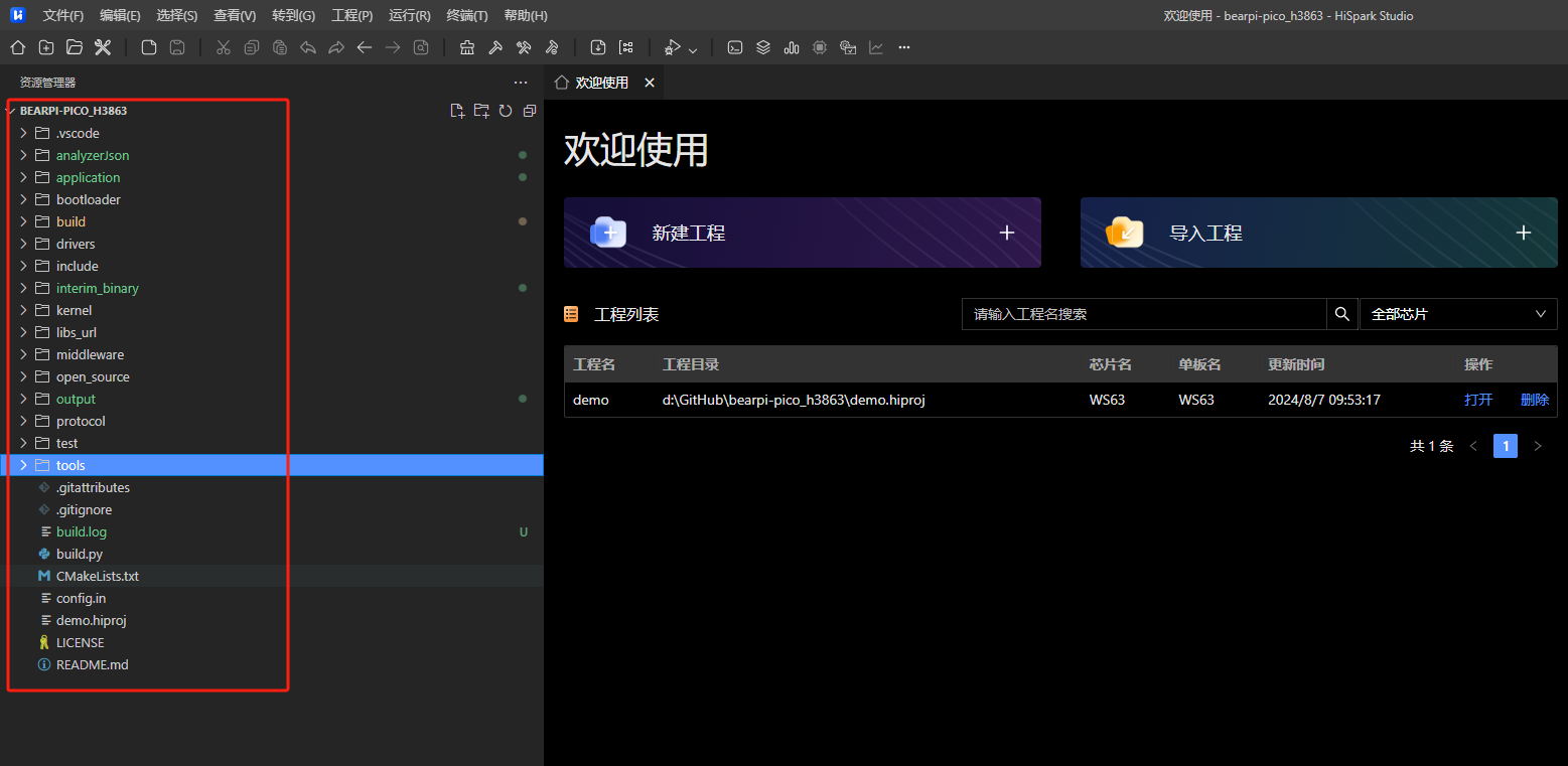 git clone https://gitee.com/bearpi/bearpi-pico_h3863.git或者点击直接下载代码包,并解压(请勿解压到含中文、空格、特殊字符的目录下)。