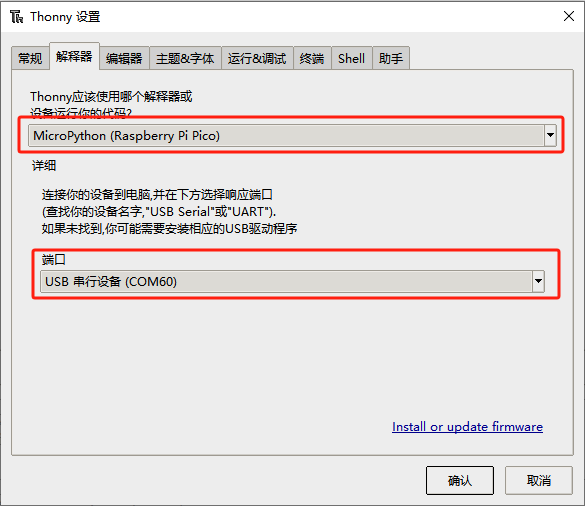 在解释器页面中选择MicroPython(Raspberry Pi Pico),并选择开发板与电脑连接后映射出的端口,点击“确定”后返回到Thonny主界面 。