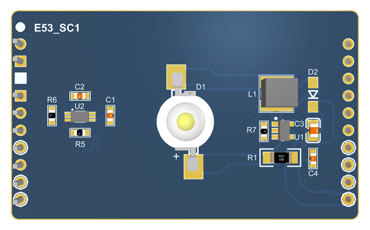 E53-SC1是一款5cm * 3cm大小的智慧路灯案例扩展板。接口协议上遵循物联网俱乐部的 E53 接口标准 ,可真实地模拟智慧路灯应用场景。